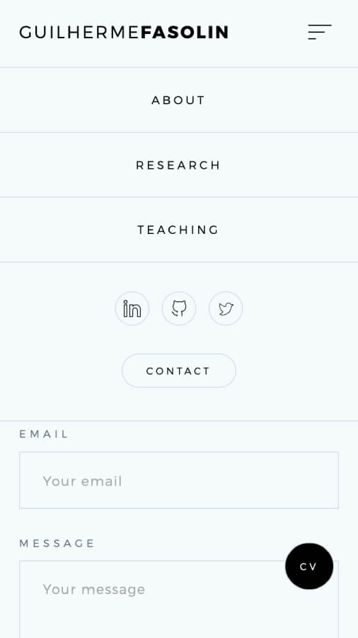 Guilherme and I worked in tandem to create a custom theme utilizing dynamic, JS cursors and grids. Easily accessible flip-card abstracts provide users with quick synopses of each article. Guilherme is able to easily upload new research projects to his site via Surreal and label them according to his custom categories.